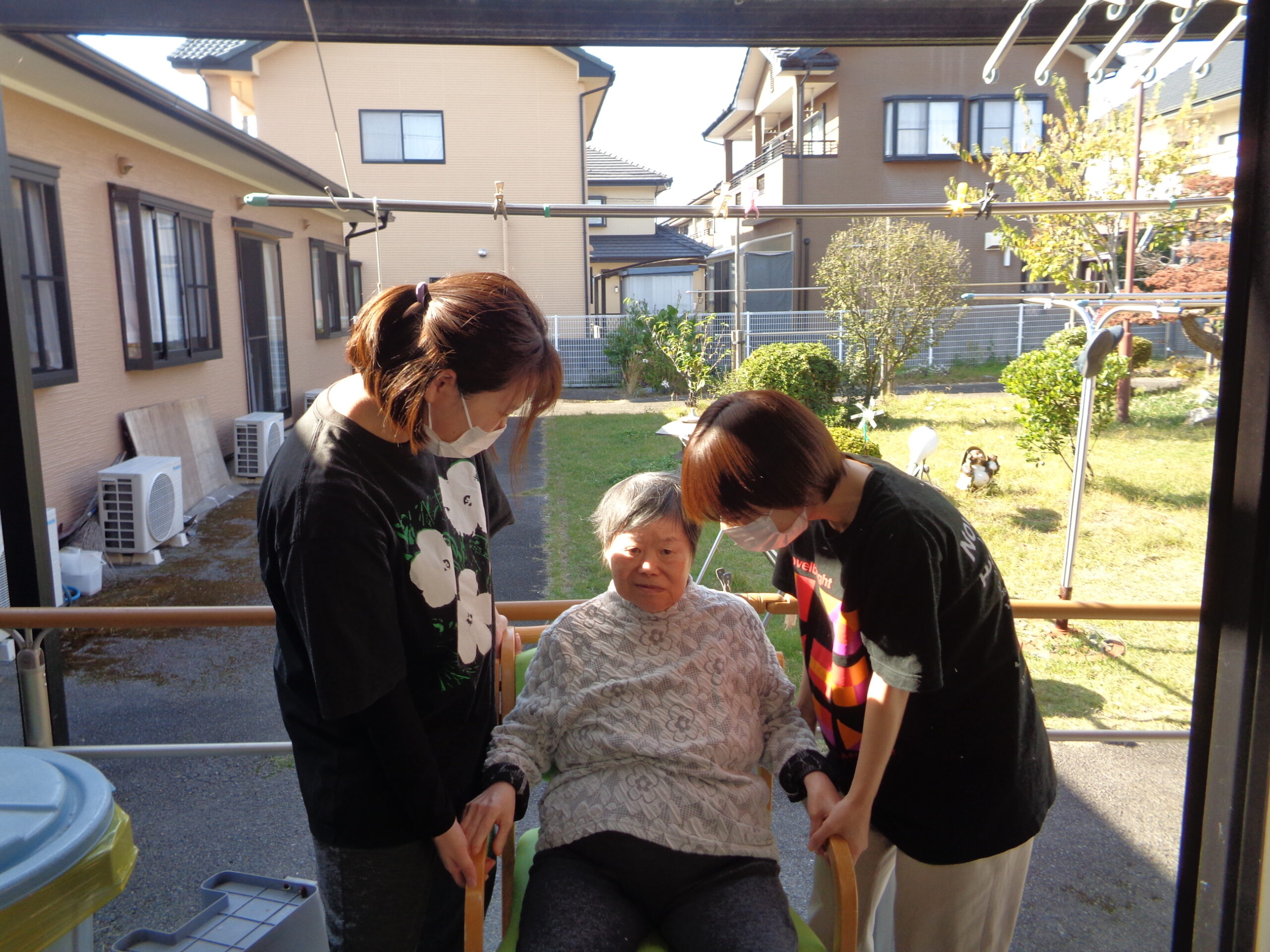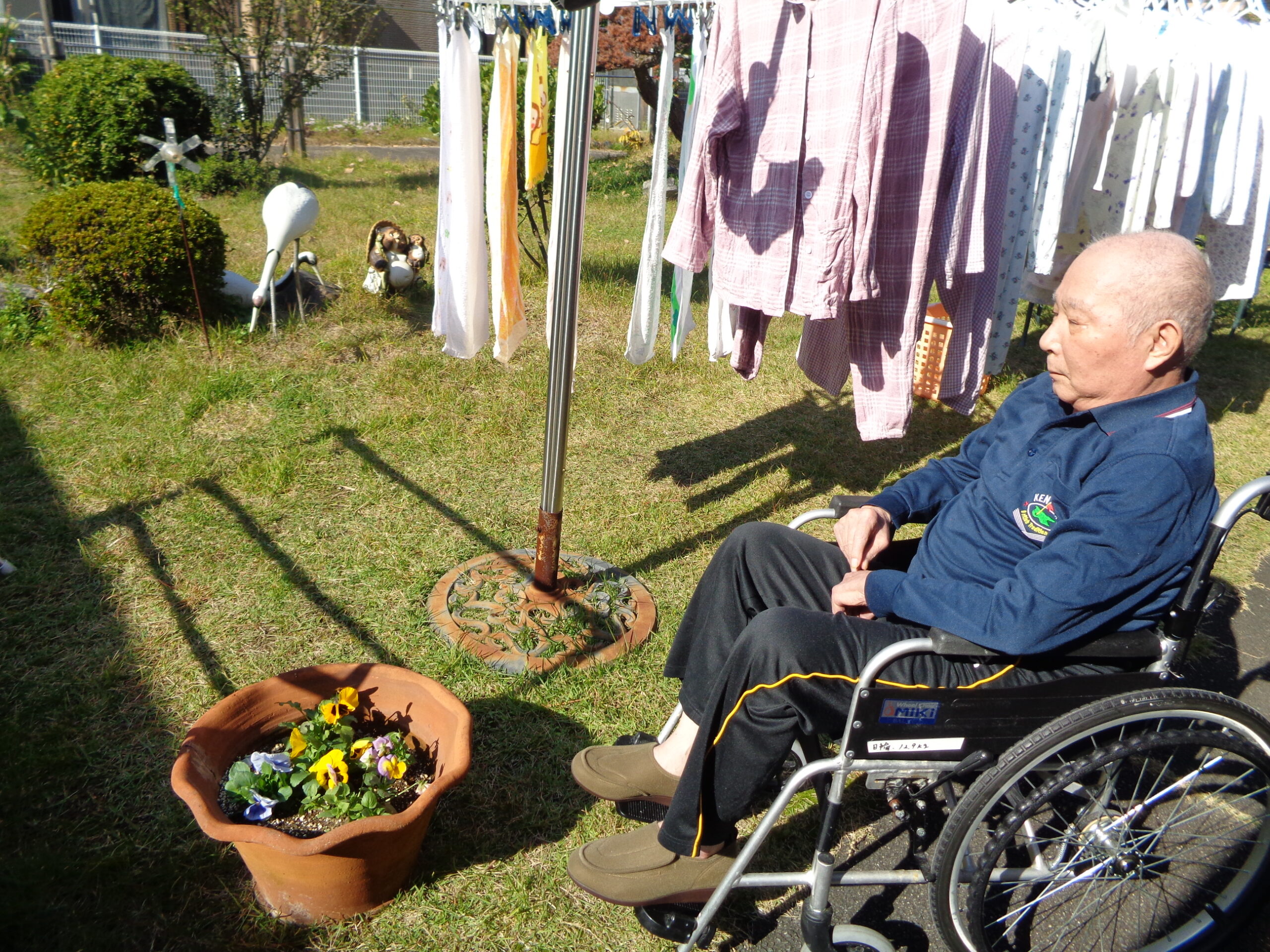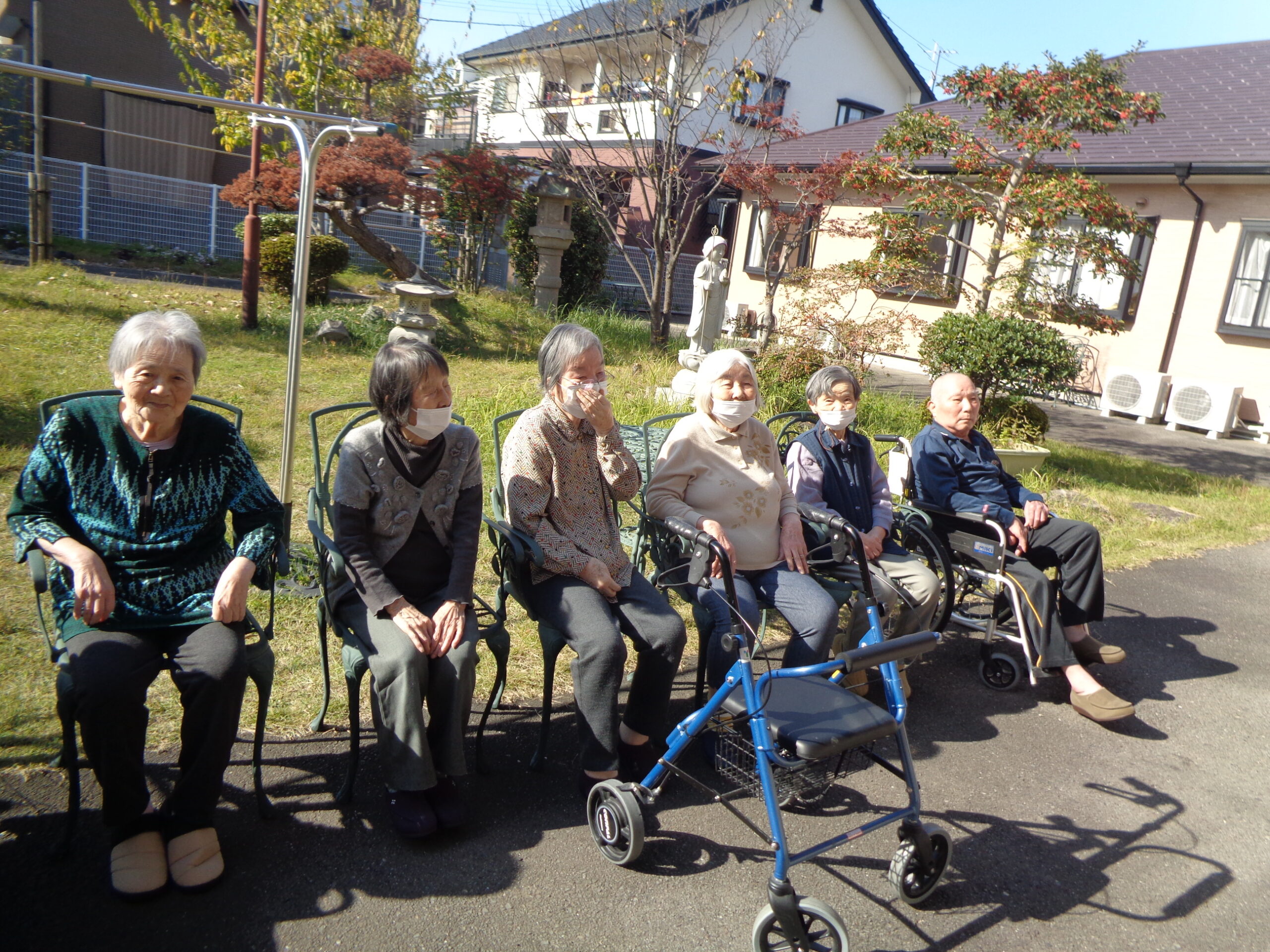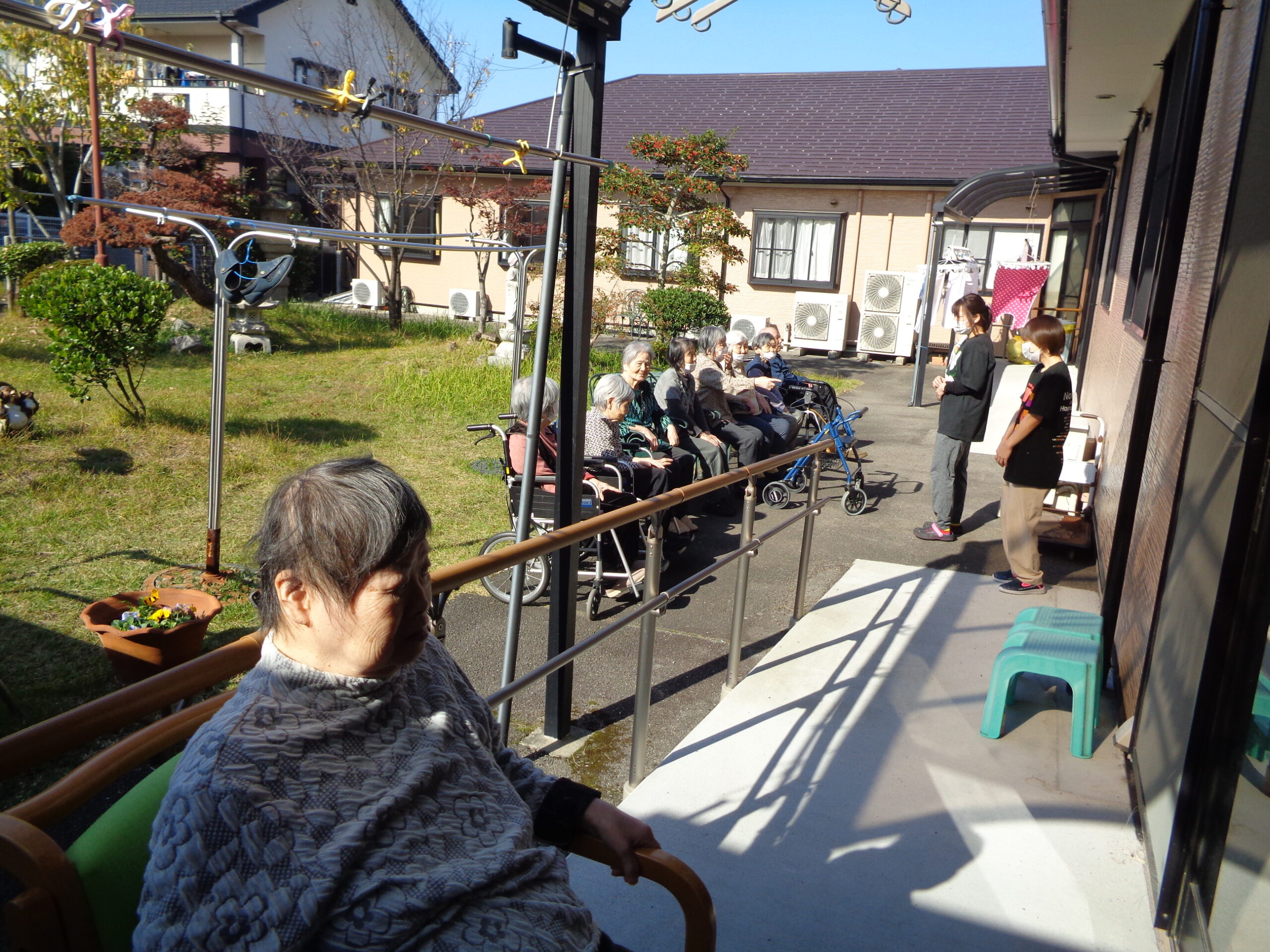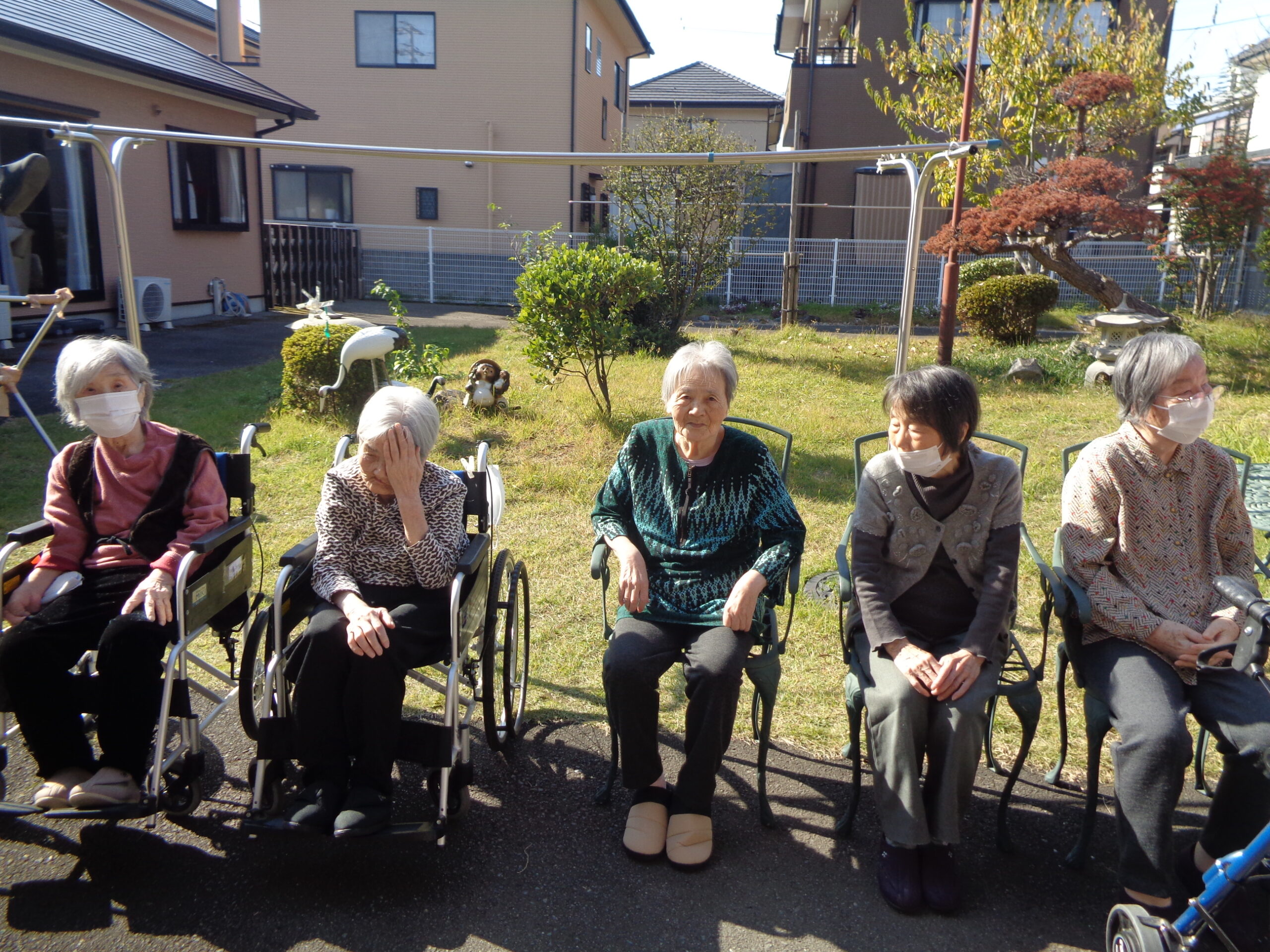 アショカ通信 2025.11.29 避難訓練(火災想定) 「歩けんのよ」動かれず。 スタッフ2人でテラスへ椅子で避難。 車椅子の方。歩行できる方全員庭に集合。 今日は温いけん良かったなー。 みんなが避難出来て良かったなー。 みんな避難完了です。 本番も慌てないで避難に集中しましょうね。 訓練ができて良かったな。