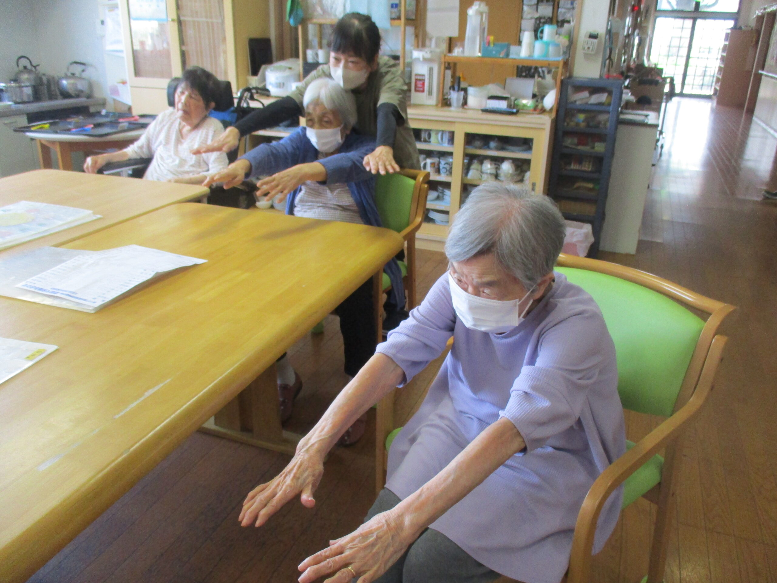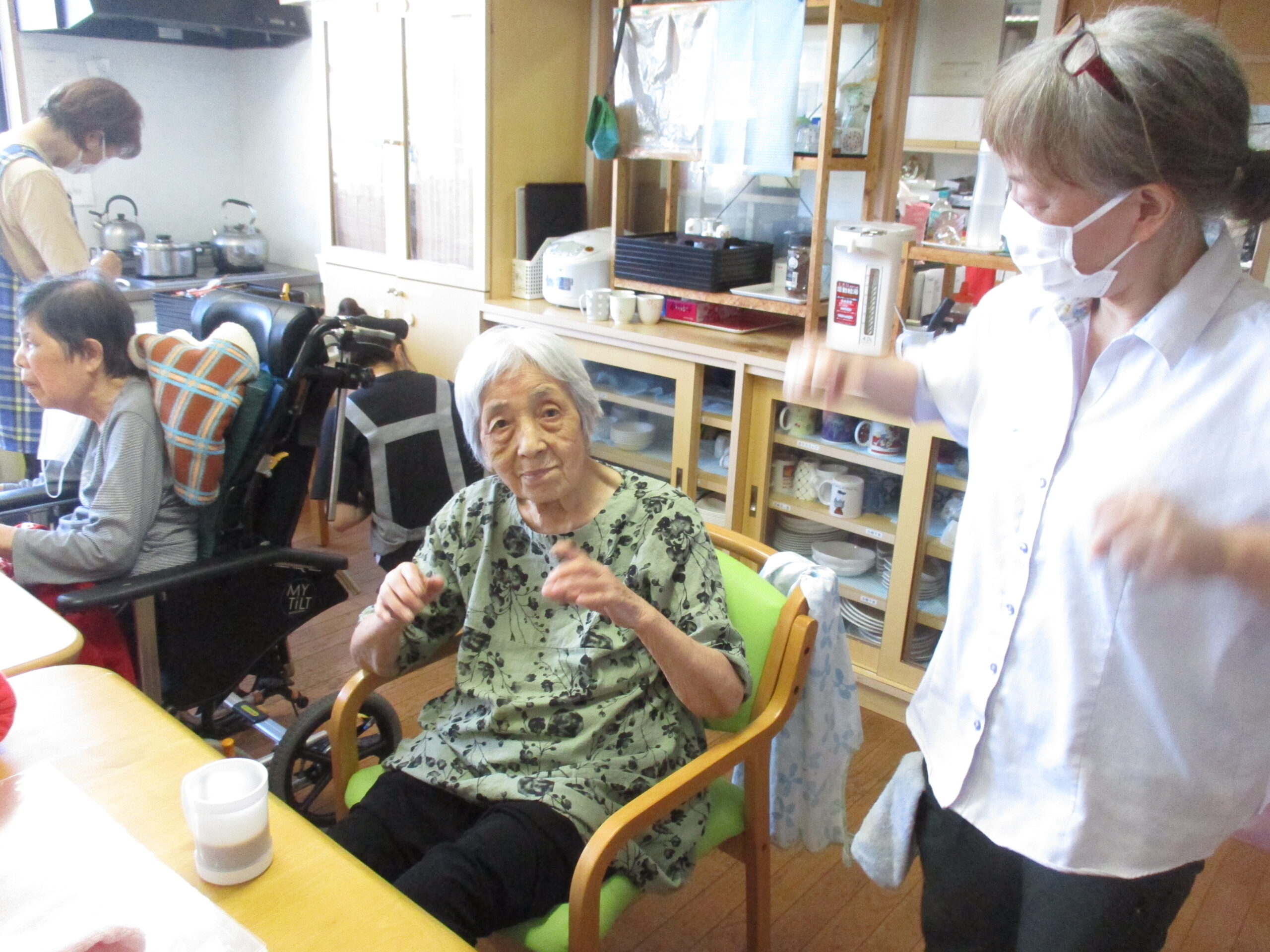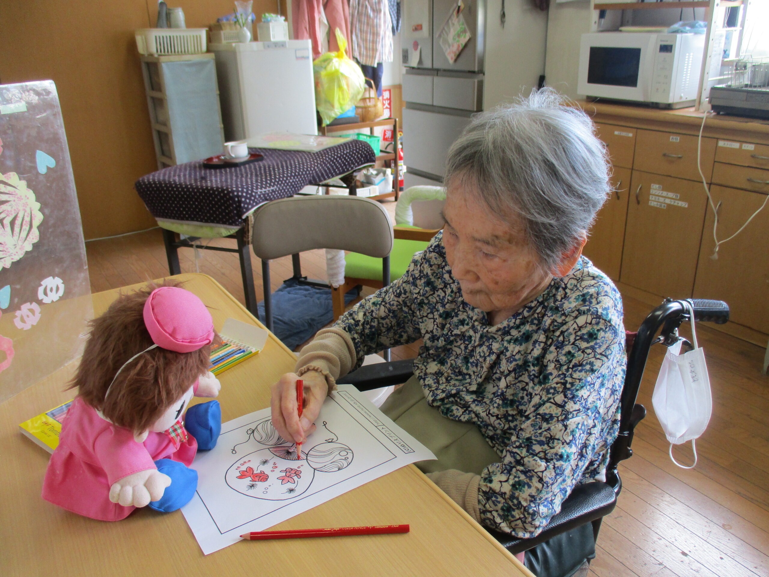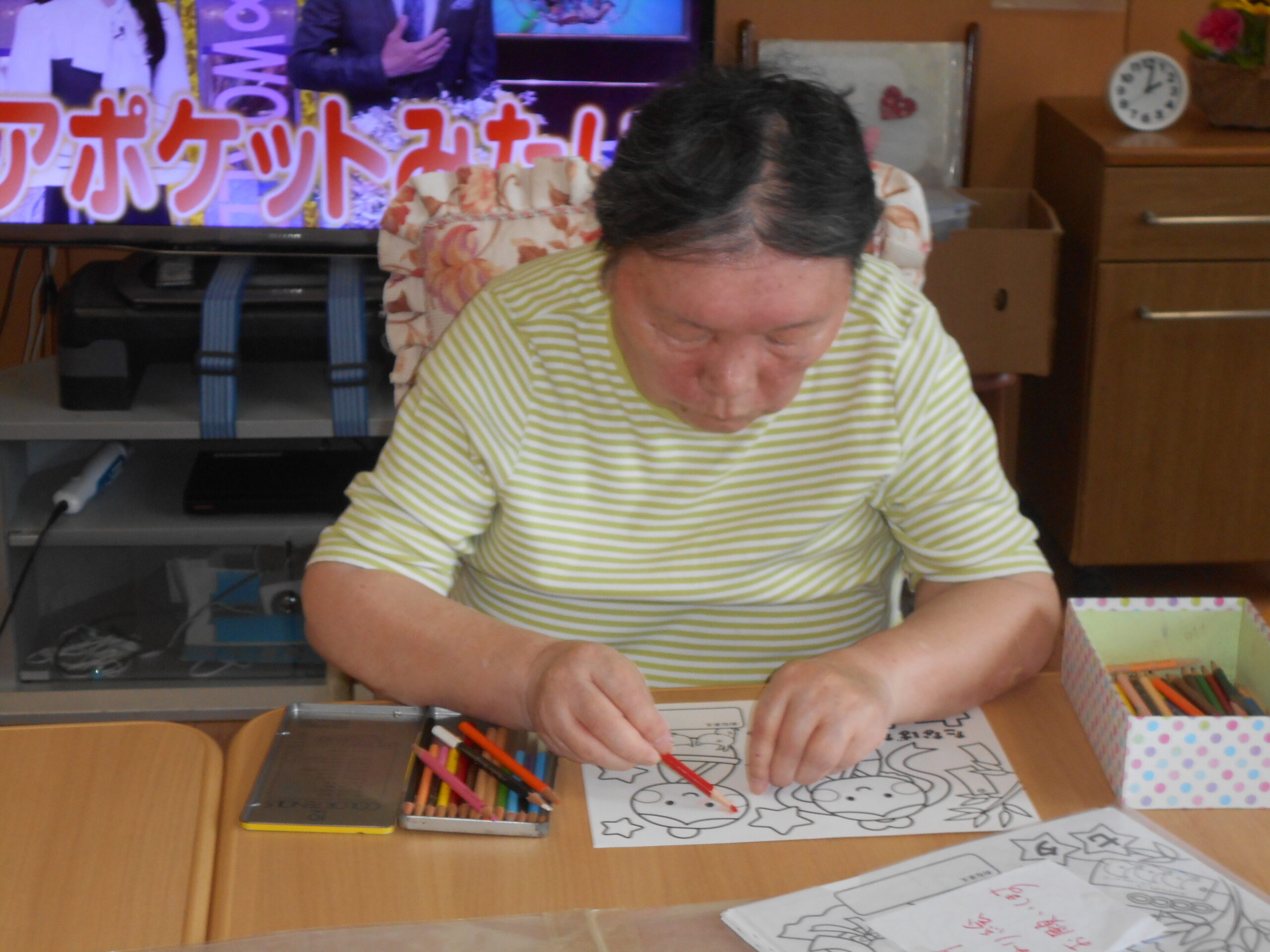 ルンビニー通信 2025.07.24 塗り絵・運動 画伯、熱中しております!! 上手に塗れよるヨ😊 素敵に仕上がりました! さあ、歩行練習しましょう(●'◡'●) 体操始めるよ~ 前に伸ばして~ イッチニッ、イッチニッ 高く手を伸ばして、それ~