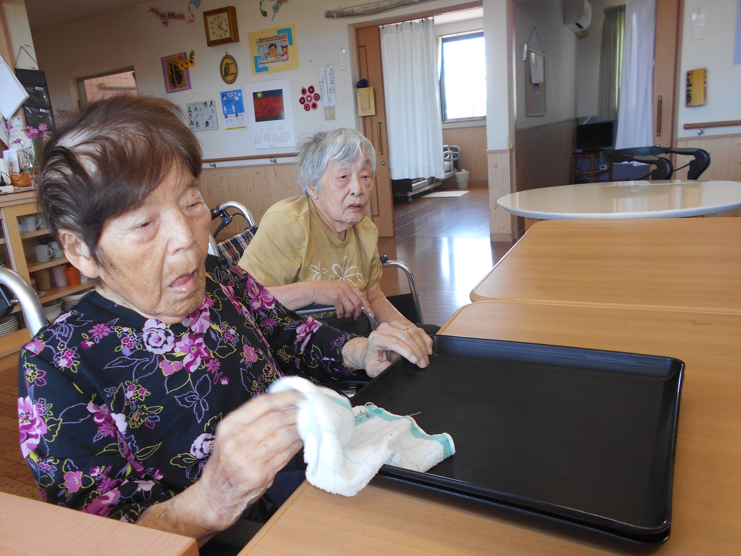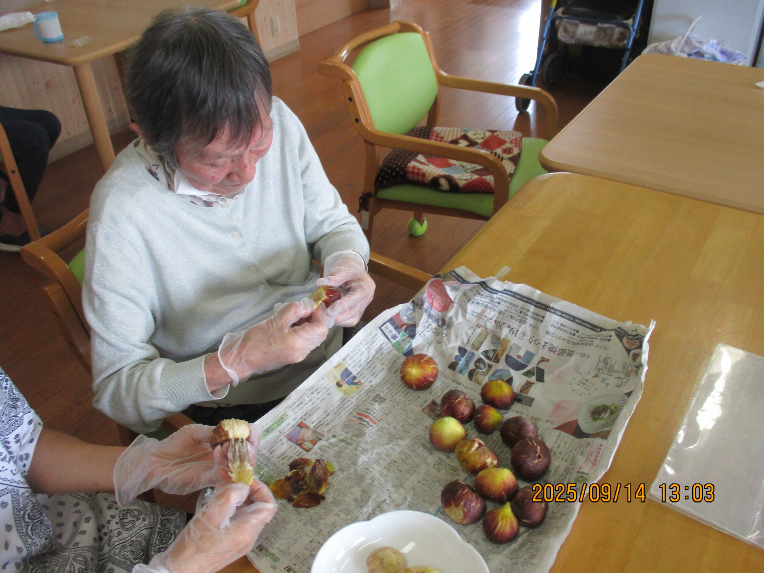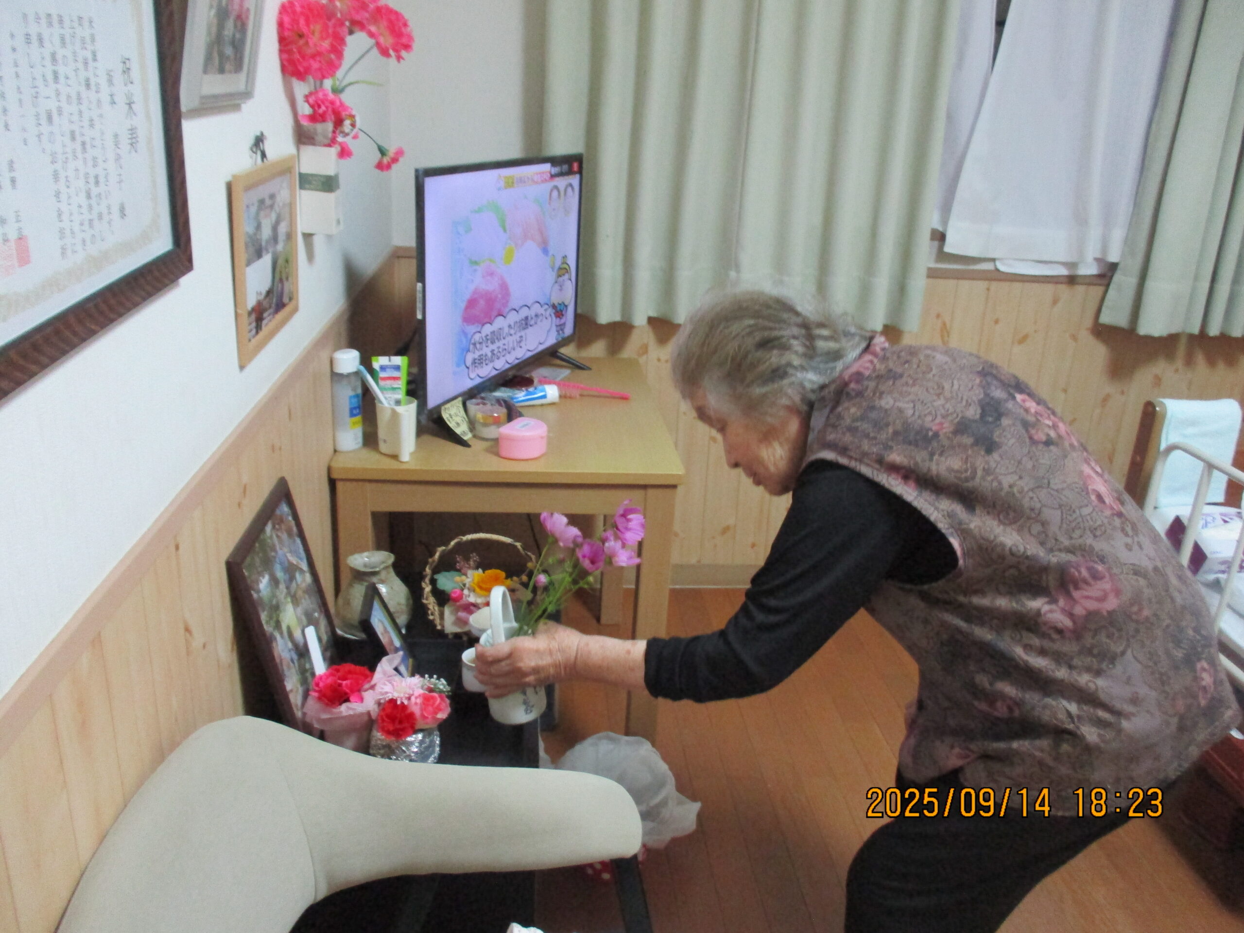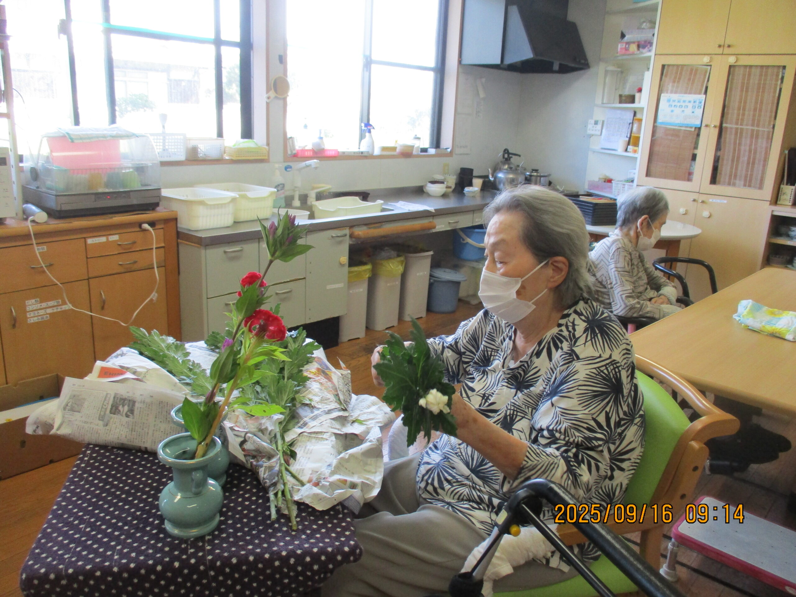 ルンビニー通信 2025.09.24 お仕事 お盆拭きは任せといて! キレイに拭いとくね💕 わたしも頑張るヨ😅 生け花は任せといてネ🧡 ご主人の仏壇へお花をお供えしているところです。 今年もいっぱい出来ました! 手先が器用です! キレイに剥けました😀