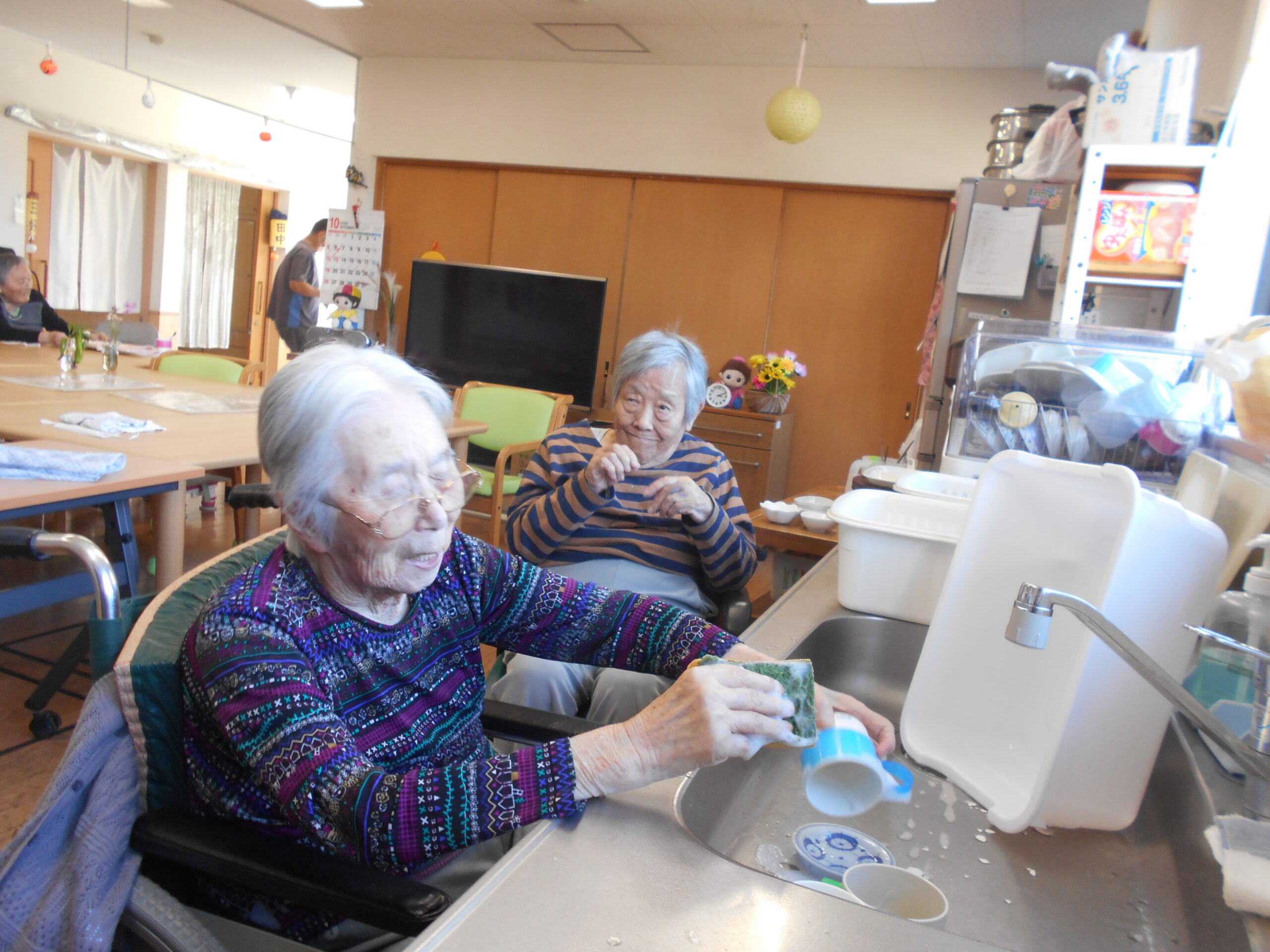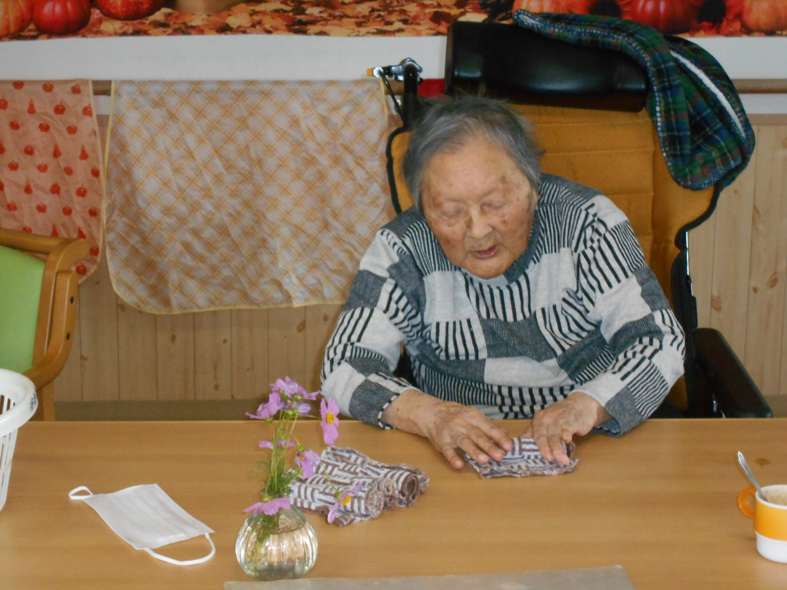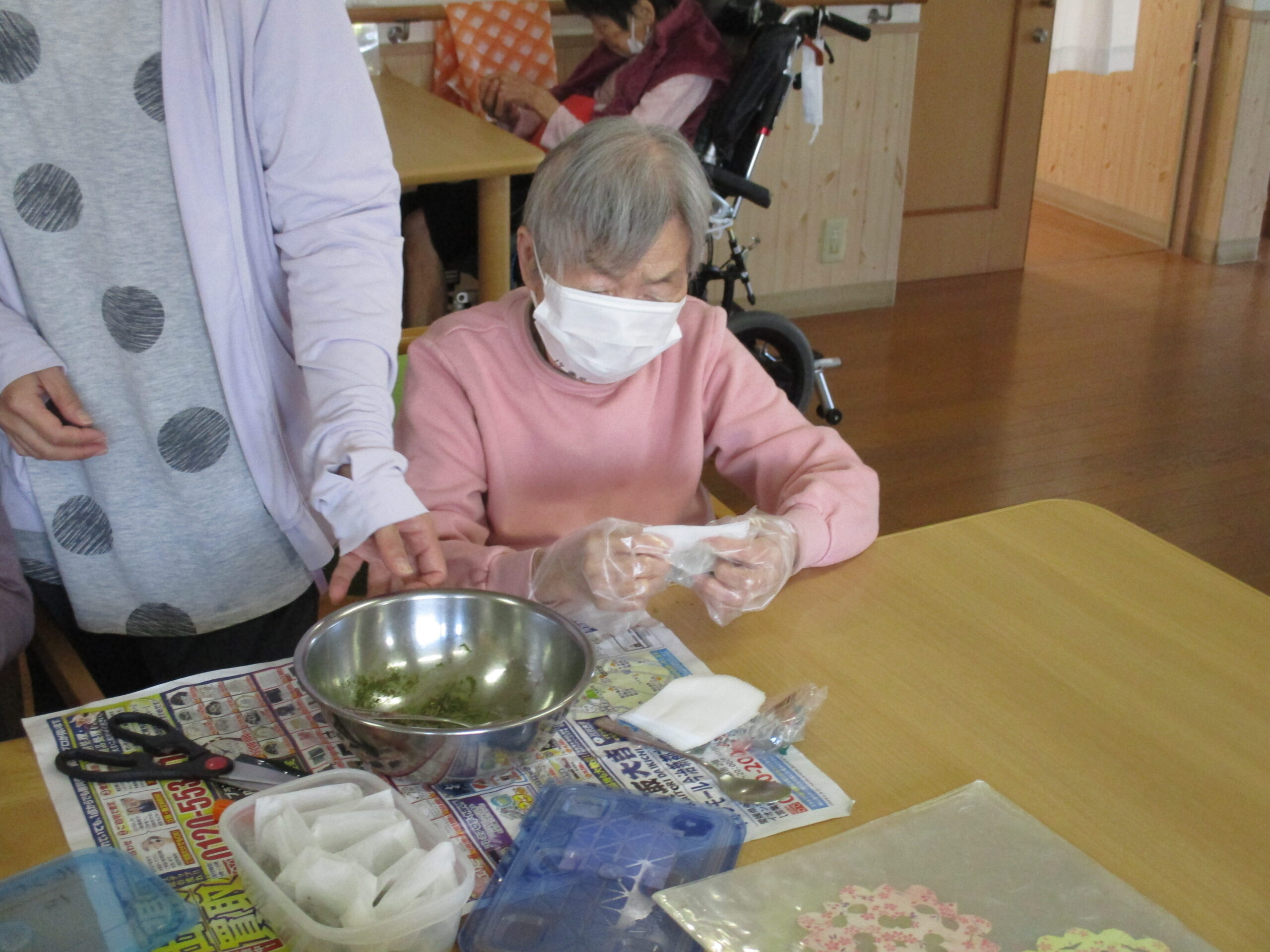 ルンビニー通信 2025.11.25 お仕事 お茶ッ葉、詰めとくね😊 私も手伝うよ! 台所仕事は任せといて😀 キレイに巻けよるよ❣️ みんなで丸めるよ(❁´◡`❁) 生け花は任せといてね🧡 上手に切れよるよ😊 いっぱいあるね!頑張ろう!